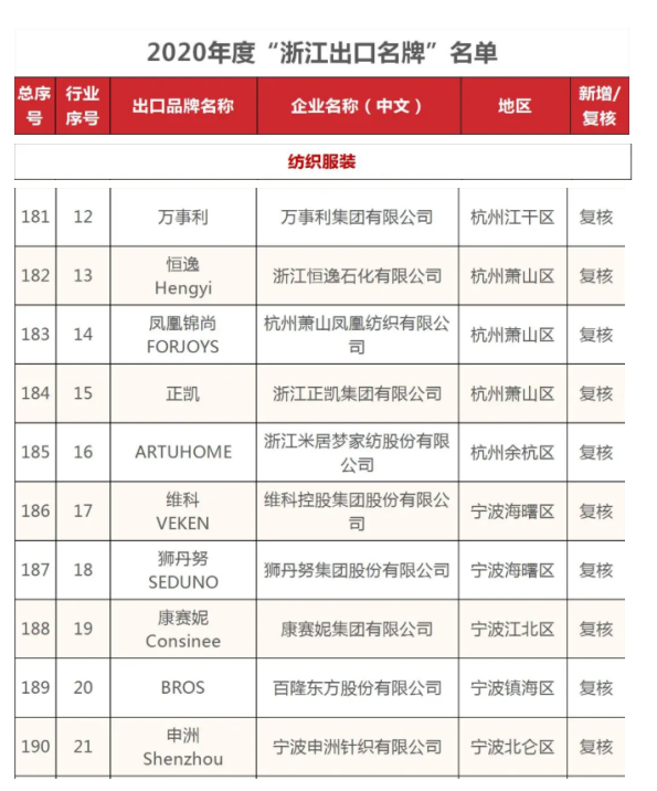 日前,浙江省商務(wù)廳公布了2020年度“浙江出口名牌”名單,維科集團(tuán)“維科VEKEN”通過(guò)復(fù)核,再獲“浙江出口名牌”稱號(hào),有效期為三年(2021--2023年)。加上之前評(píng)定的尚在有效期內(nèi)的興洋KōYō、天雪TISNOW品牌(有效期2019--2021年),集團(tuán)目前已有三個(gè)“浙江出口名牌”。