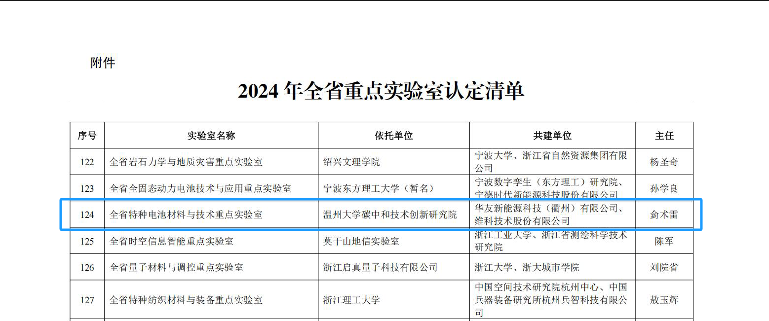 2025年6月3日,浙江省科學(xué)技術(shù)廳發(fā)布了《關(guān)于公布2024年全省重點(diǎn)實(shí)驗(yàn)室認(rèn)定結(jié)果的通知》,維科技術(shù)以共建單位申報(bào)的“全省特種電池材料與技術(shù)重點(diǎn)實(shí)驗(yàn)室”成功入選全省重點(diǎn)實(shí)驗(yàn)室名單。