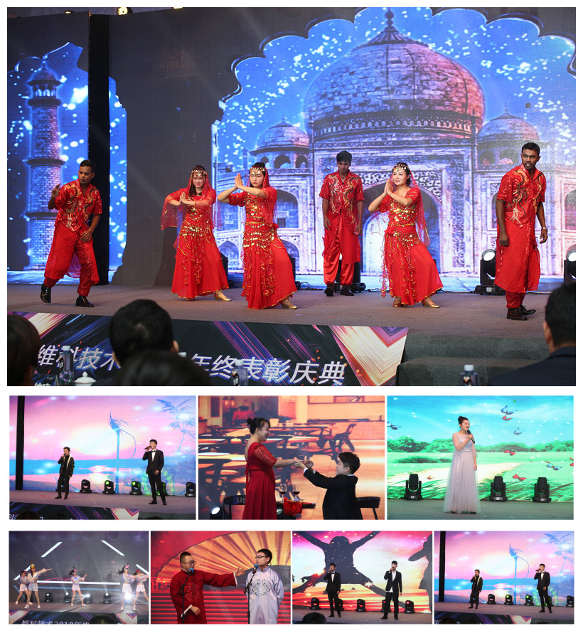 年會(huì)中活躍的氣氛、創(chuàng)意的節(jié)目、精美的獎(jiǎng)品使得慶典在表彰的同時(shí)不失趣味。獨(dú)唱、舞蹈、串燒、合唱、相聲、魔術(shù)應(yīng)有盡有,印象尤為深刻的有舞蹈《Chinese & Indian illusions 》,聯(lián)誼印度員工,一起跳起神秘國(guó)度的舞蹈,獻(xiàn)舞2018年維科技術(shù)印度市場(chǎng)的突破,同時(shí)也表達(dá)了公司對(duì)前往達(dá)曼工作,為公司開拓印度市場(chǎng)沖鋒陷陣,披荊斬棘員工們的關(guān)心和關(guān)注。與此同時(shí),我們也收到了在異國(guó)他鄉(xiāng)的維科員工的新年祝福。