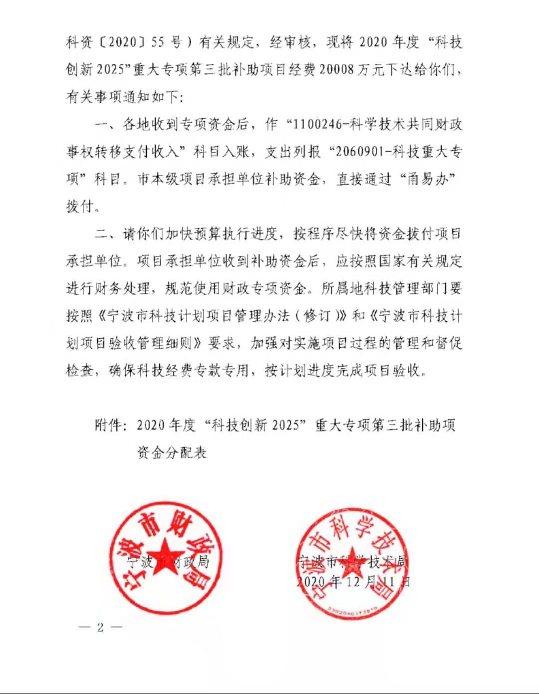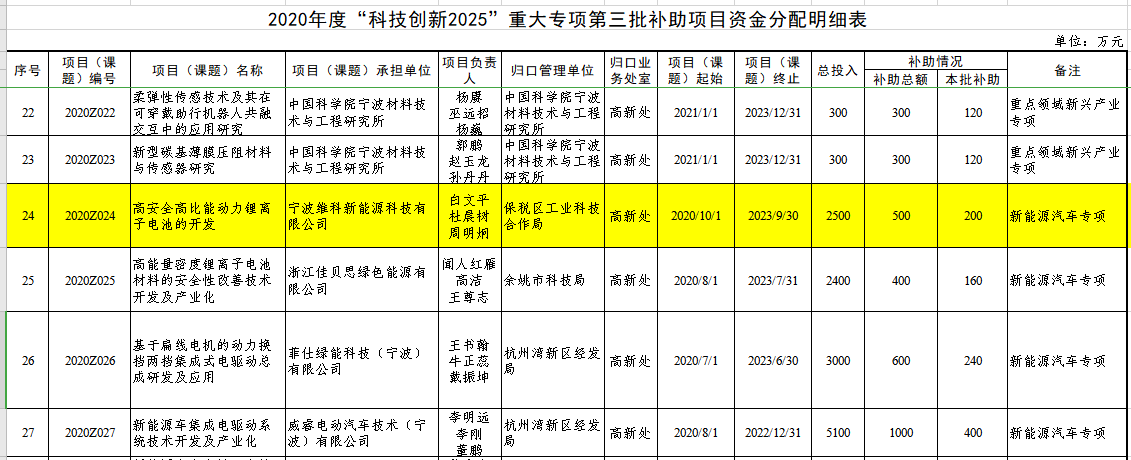 12月15日、寧波市財(cái)政局は「寧波市2020年科學(xué)技術(shù)発展特別基金(第3回バッチ補(bǔ)助金の主要特別プロジェクト)の発行に関する通知」(Ningbo Finance [2020] No.1214)を発行し、寧波VEKEN新エネルギーテクノロジー有限公司が宣言した「高安全?高比エネルギー動(dòng)力リチウムイオン電池の開発」プロジェクトが採(cǎi)択された。 2020年に寧波市から「科學(xué)技術(shù)革新2025」大型特別プロジェクトの受注に成功し、第一期の補(bǔ)助金200萬(wàn)元を獲得した。