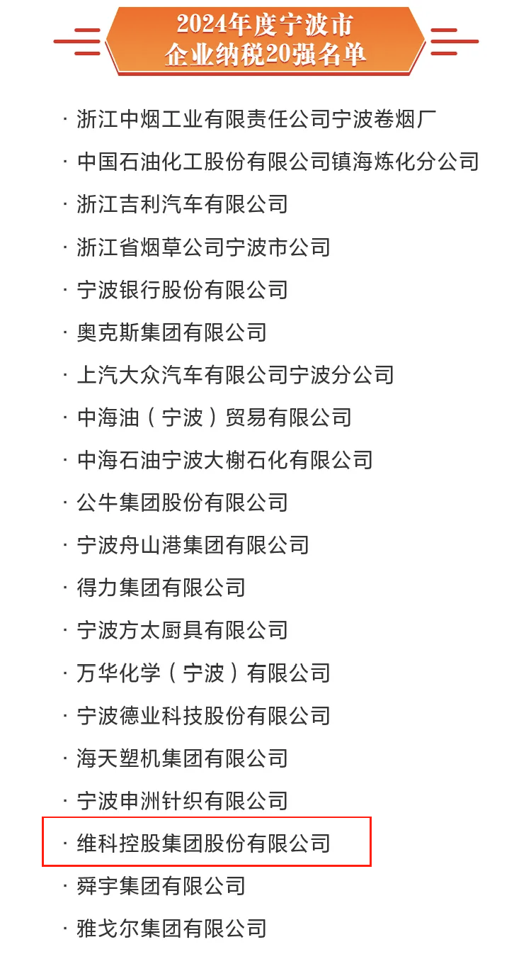 6月13日、2025年寧波市 「科學(xué)技術(shù)革新と産業(yè)革新の深い統(tǒng)合を促進(jìn)し、民間経済の質(zhì)の高い発展を加速するための會(huì)議 」と 「2025寧波起業(yè)家精神とイノベーションリスト 」リスト発表活動(dòng)が開(kāi)催され、維科グループは、「2024寧波納稅トップ20企業(yè) 」賞を受賞した?!?024年寧波納稅トップ20企業(yè) 」を獲得した。