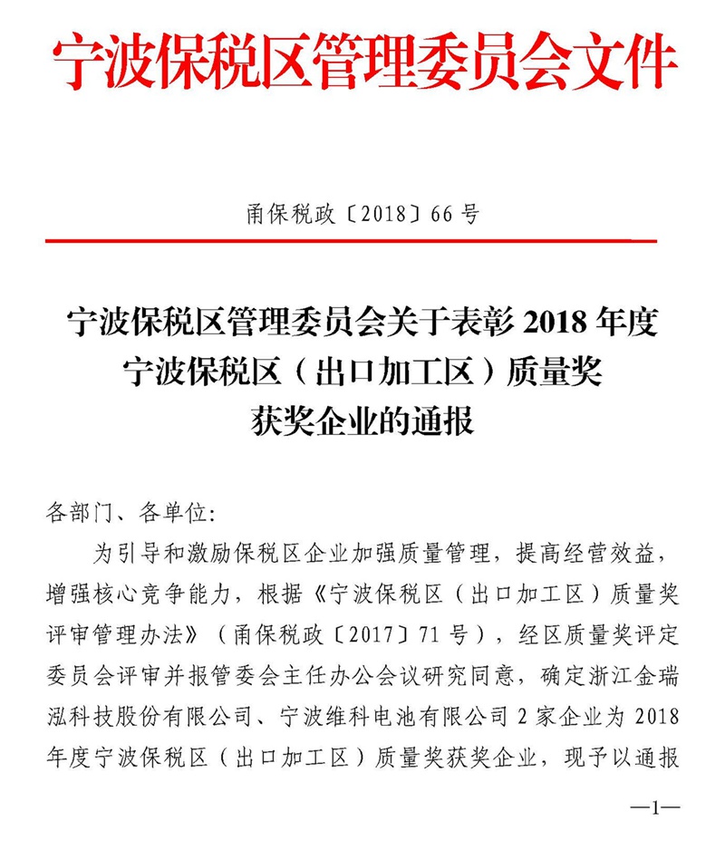 2018年11月4日、寧波市保稅區(qū)管理委員會(huì)は文章を公開して通報(bào)した。そのうち、2018年度寧波保稅區(qū)(輸出加工區(qū))品質(zhì)賞受賞企業(yè)を表彰し、維科技術(shù)旗子會(huì)社寧波維科電池有限會(huì)社がこの栄譽(yù)を受賞し、區(qū)內(nèi)の第1回品質(zhì)賞が2社しかない企業(yè)の一つとなった。