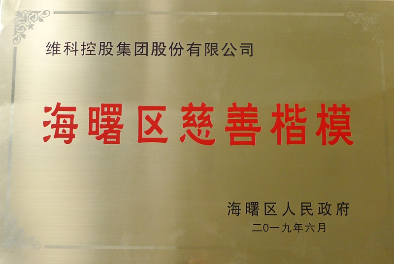 2019年6月11日午後、海曙區(qū)政府は2019年慈善活動會議を開催した。団結(jié)互助、貧困扶助の慈善文化を大いに発揚し、社會各界の公益に熱心で、貢獻に好む良好な気風を唱道するため、會儀中海曙區(qū)人民政府は公益慈善分野で際立った貢獻をした企業(yè)?事業(yè)體、郷鎮(zhèn)、街道、コミュニティ及び個人を表彰し、維科持株グループ株式會社は「海曙區(qū)慈善模範」の稱號を獲得した。